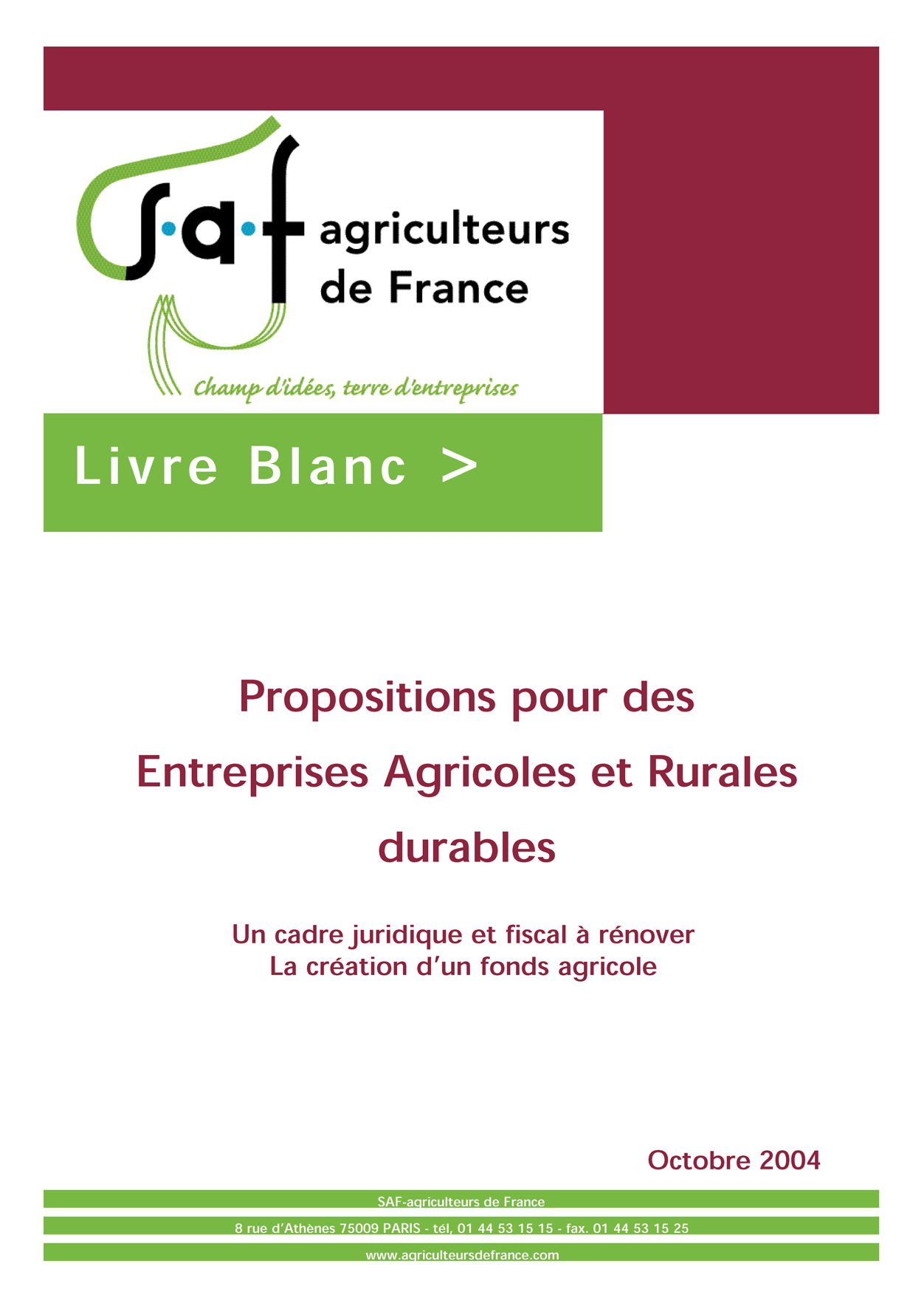 Paru en octobre 2004, le Livre blanc de la Société des Agriculteurs de France, intitulé « Propositions pour des entreprises agricoles et rurales durables : un cadre juridique et fiscal à rénover, la création d’un fonds agricole », préfigurait ce passage de l’exploitation à l’entreprise agricole consacré par le législateur de 2006...