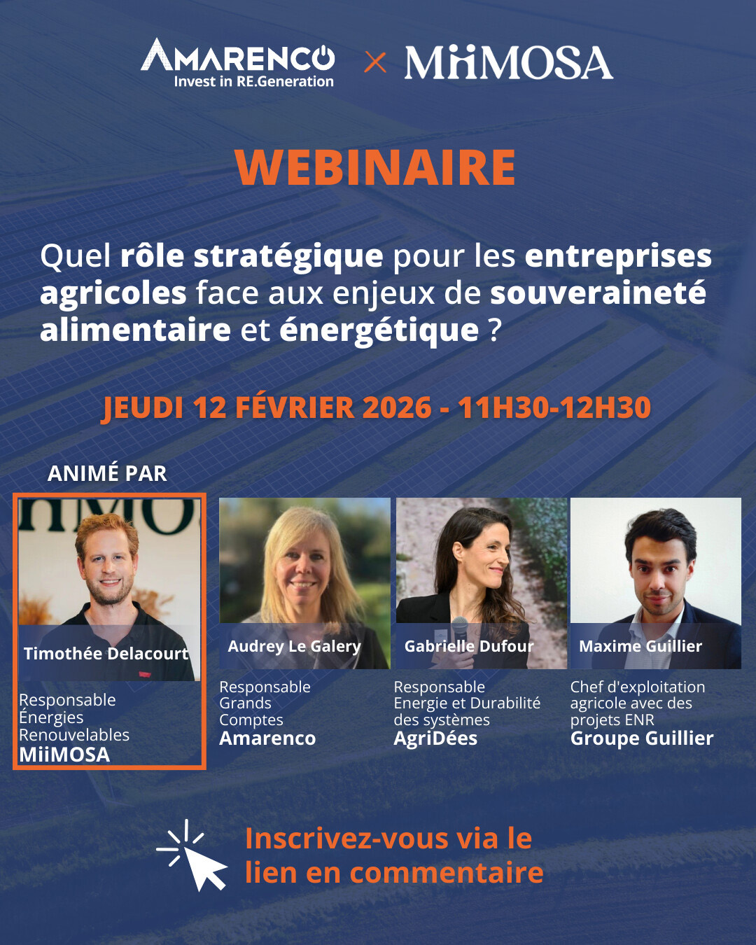 MiiMOSA, plateforme de financement exclusivement dédiée à l’agriculture et à l’alimentation et Amarenco, producteur indépendant d’énergie photovoltaïque organisent un webinaire sur le rôle des entreprises agricoles dans les projets énergétiques agricoles.