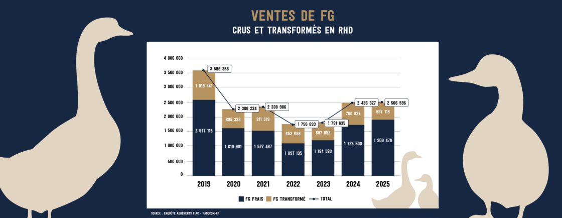 En restauration hors domicile, la reprise est engagée mais reste incomplète. Les ventes de foie gras ont progressé de +43,2 % par rapport à 2022, point bas de la crise. Malgré cette progression, les niveaux d’avant 2019 ne sont pas encore retrouvés. Le CIFOG indique que « la filière poursuit ses actions pour accompagner les professionnels, notamment via des dispositifs de formation, des événements et des outils numériques dédiés ».