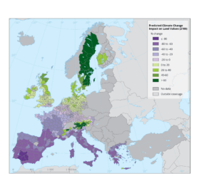 Longtemps considérées comme une valeur refuge, les terres agricoles pourraient perdre cette aura protectrice. Selon une carte publiée par l’Agence européenne pour l’environnement (AEE), plus de 60 % des terres agricoles européennes verraient leur valeur diminuer d’ici 2100, dans un scénario climatique de fortes émissions de gaz à effet de serre (SRES A2)[1].